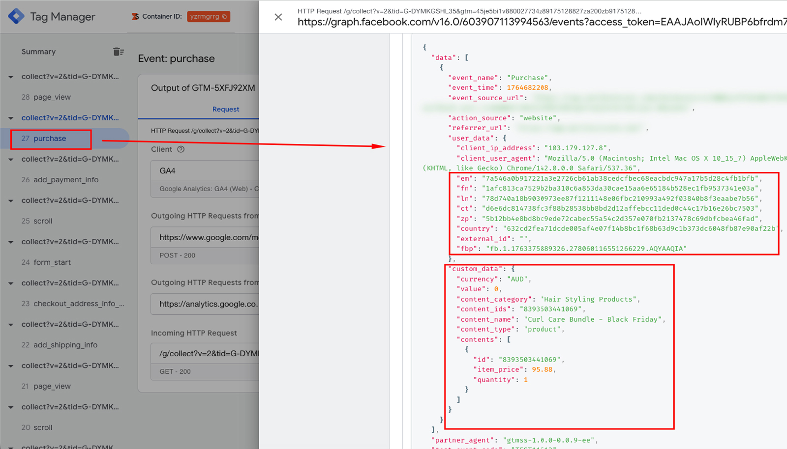 Using the GTM Server Event Debugger and Meta’s Test Events tool, I validated: