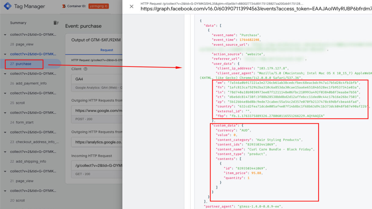 Using the GTM Server Event Debugger and Meta’s Test Events tool, I validated: